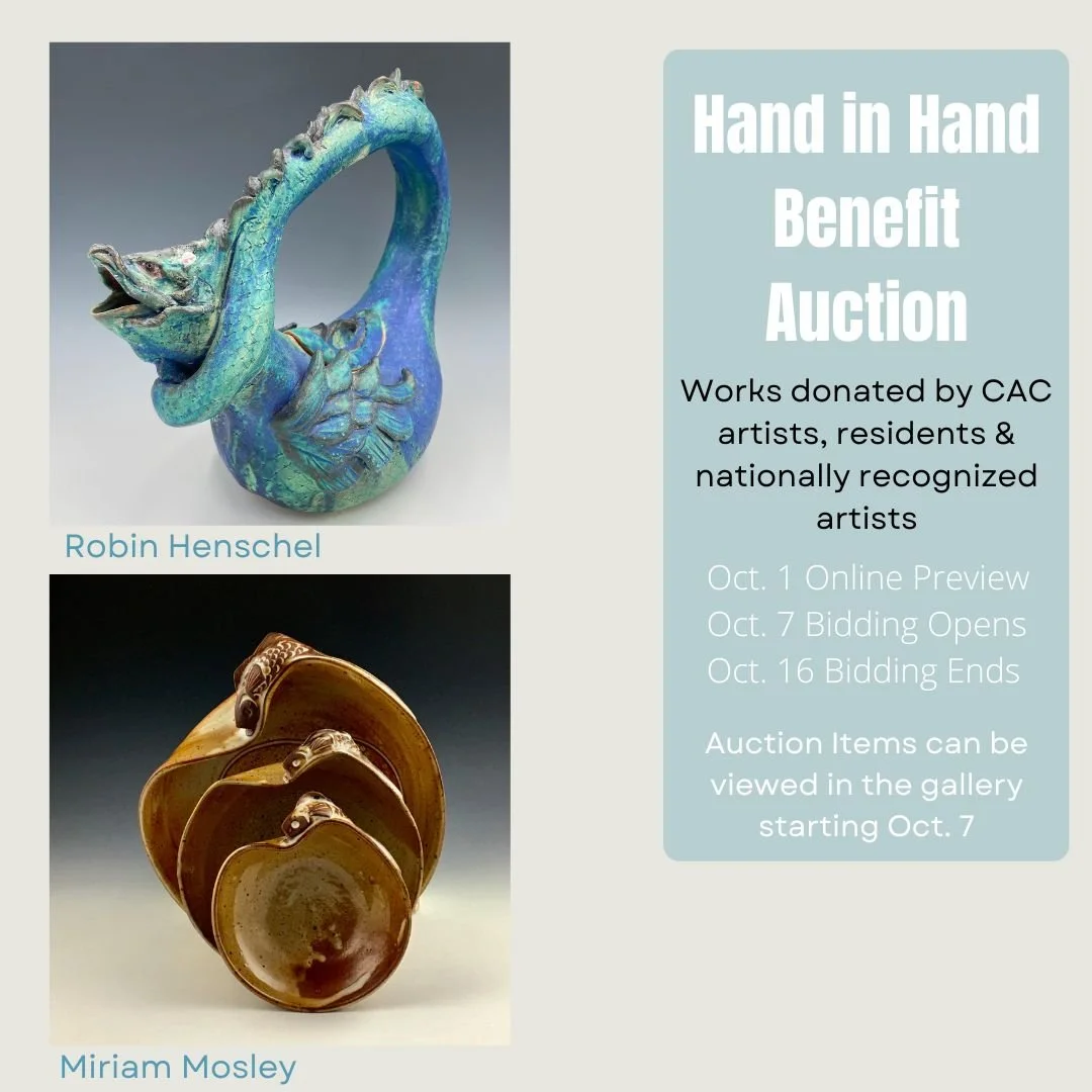 HAND IN HAND BENEFIT AUCTION (October 1 - 16). Our virtual auction will include ceramic items donated by nationally recognized ceramic artists, residents and Clay Art Center artists. Preview of the full auction begins online October 1st. Bidding online opens October 7th and closes October 16th. All Auction items will be available to view in the gallery starting October 7th. Hand in Hand event attendees will be able to view the items in-person before bidding online.