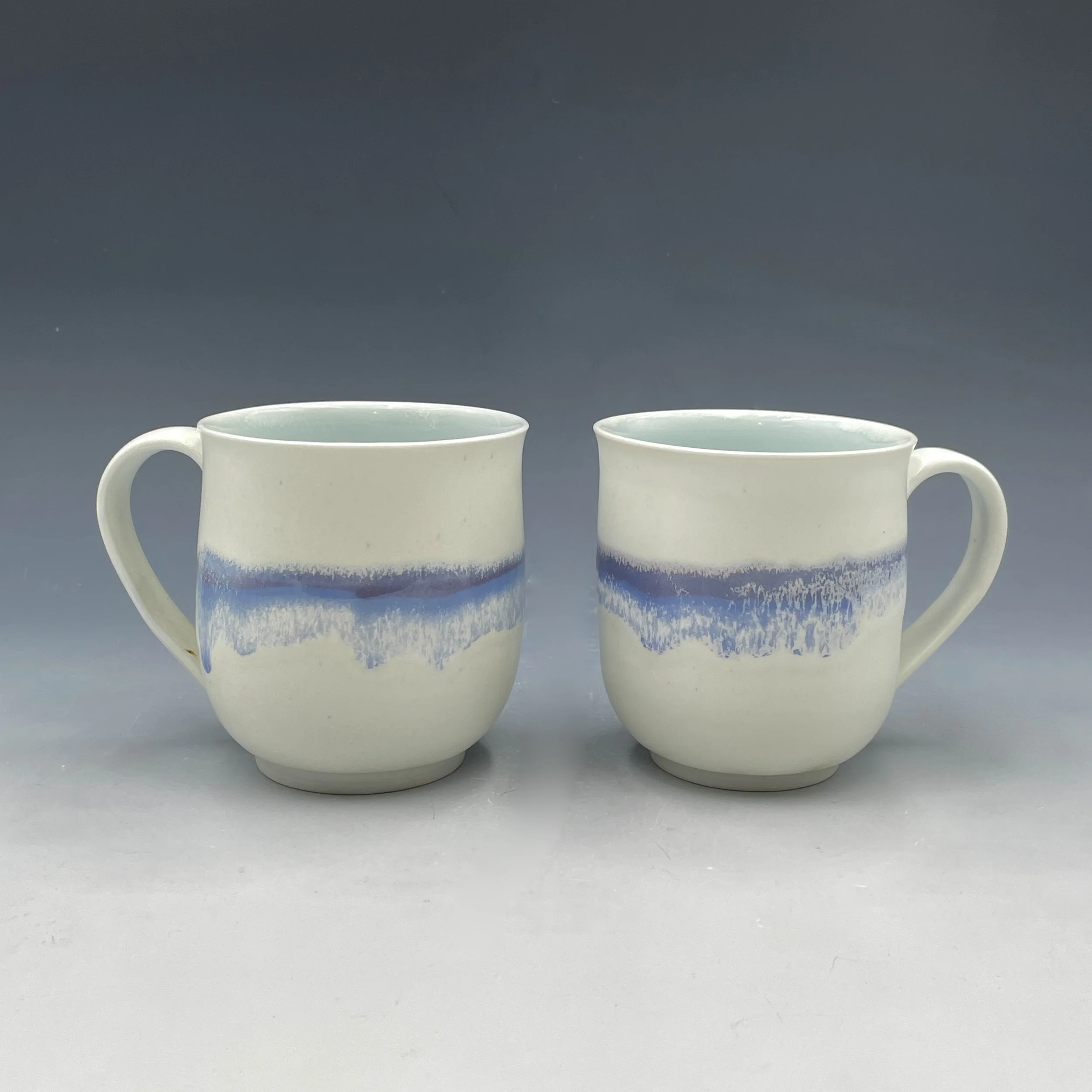 Artist Claire Cohen is often drawn to elements of nature when creating her works in porcelain. Claire thinks of her work as functional art, and states that, “Whether in form or glaze, I want my pieces to evoke a sense of freedom and movement that can be enjoyed even when the piece is not in use.” As she creates her work, Claire considers how her work will be used, and that consideration informs her decisions about every aspect of the design. “When I’m making cups, I always think about how they will feel in someone’s hands,” Claire shares, “The handle as well as the surface. My mugs have a matte white that overlaps a pop of glossy color, which gives them a velvety feeling when held in your hand that I hope enhances the experience of savoring a warm drink.” Claire’s contemporary mugs bring both elegance and comfort to the sipping experience.