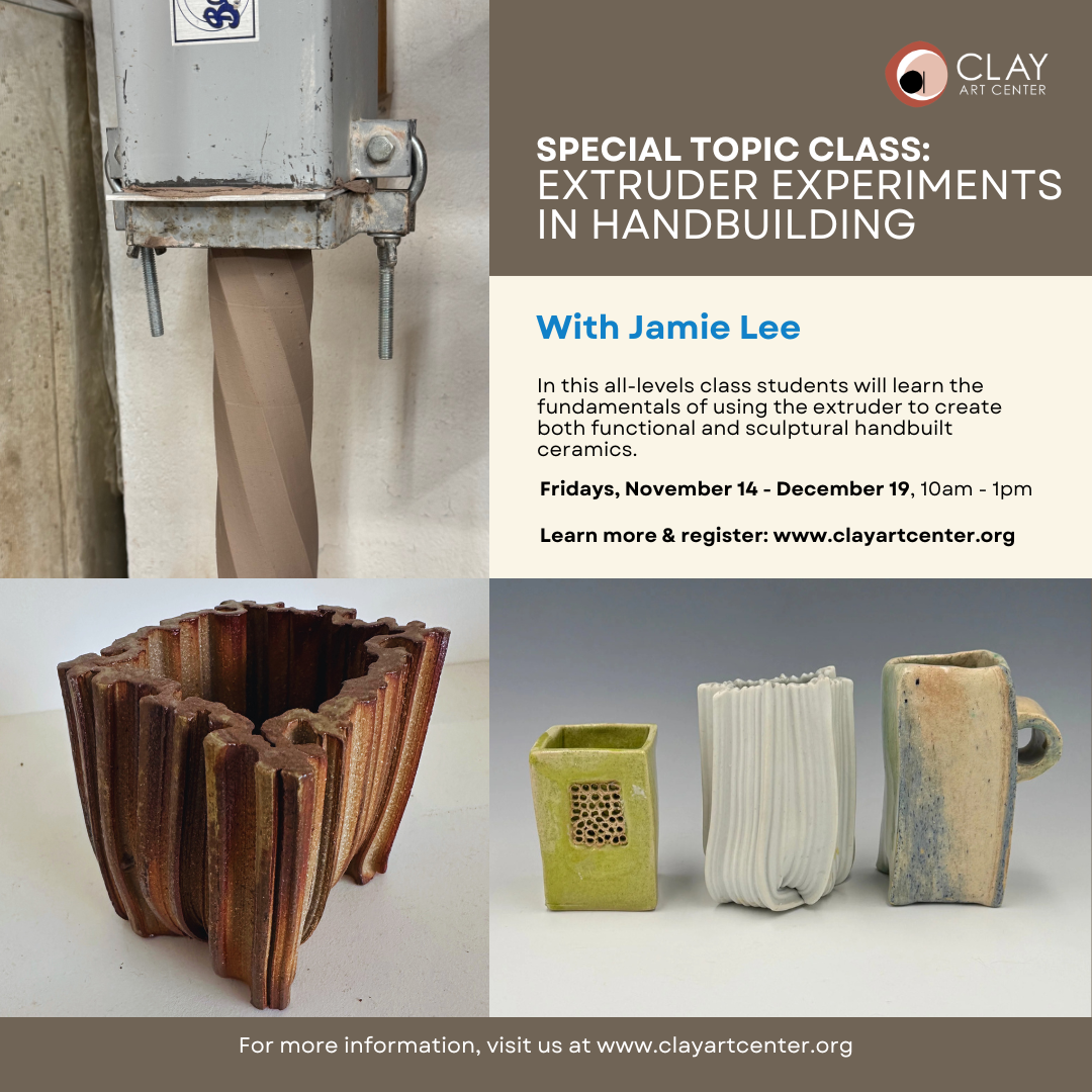 The clay extruder is an over looked and under utilized device in many clay studios. In this all levels class students will learn the fundamentals of the extruder to level up handbuilt projects. The extruder can be utilized for both functional and sculptural handbuilding.