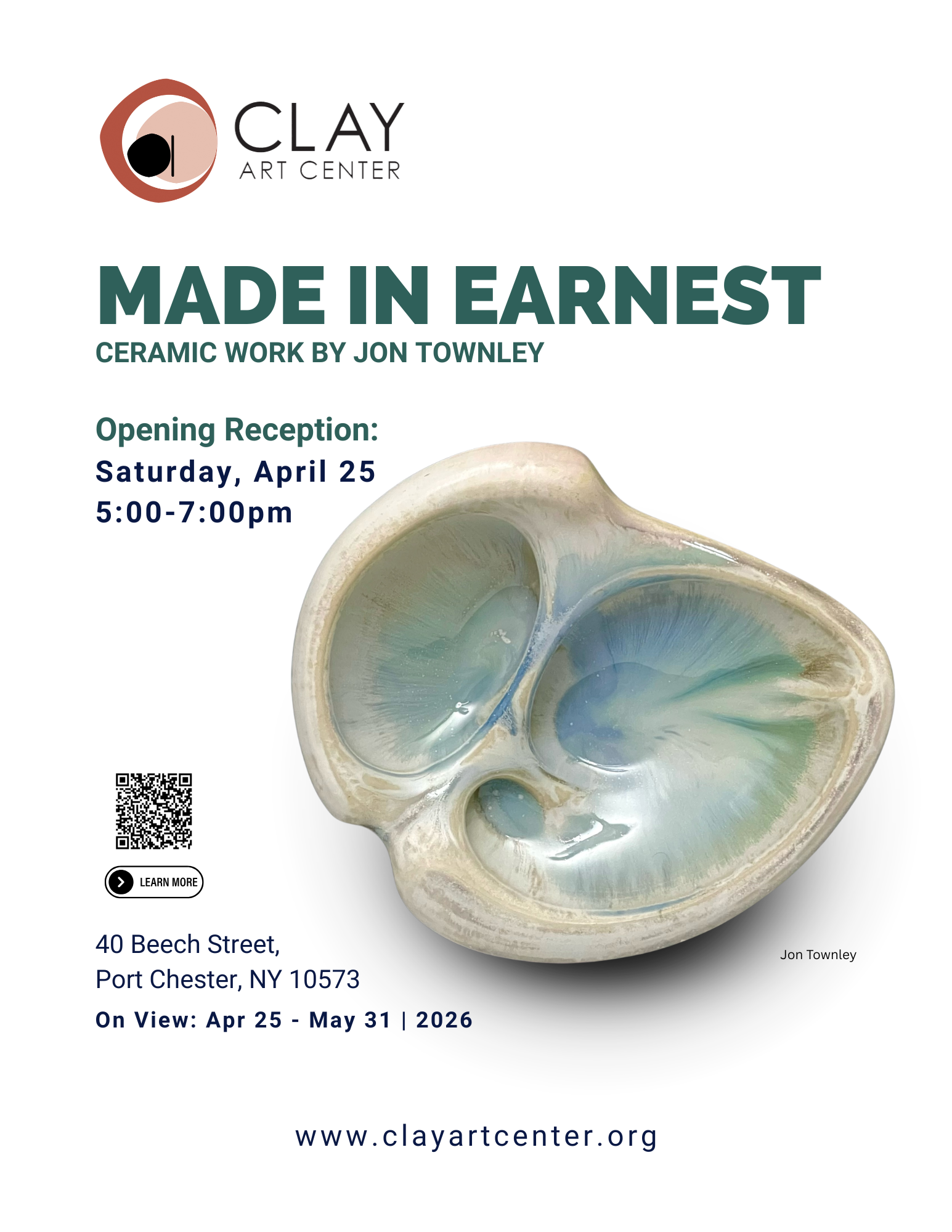 Clay Art Center is pleased to present Made in Earnest: Ceramic Work by Jon Townley. This solo exhibition presents handmade ceramic sculpture and pottery, and is the inaugural exhibition in Clay Art Center’s Curator’s Choice series.